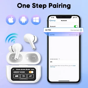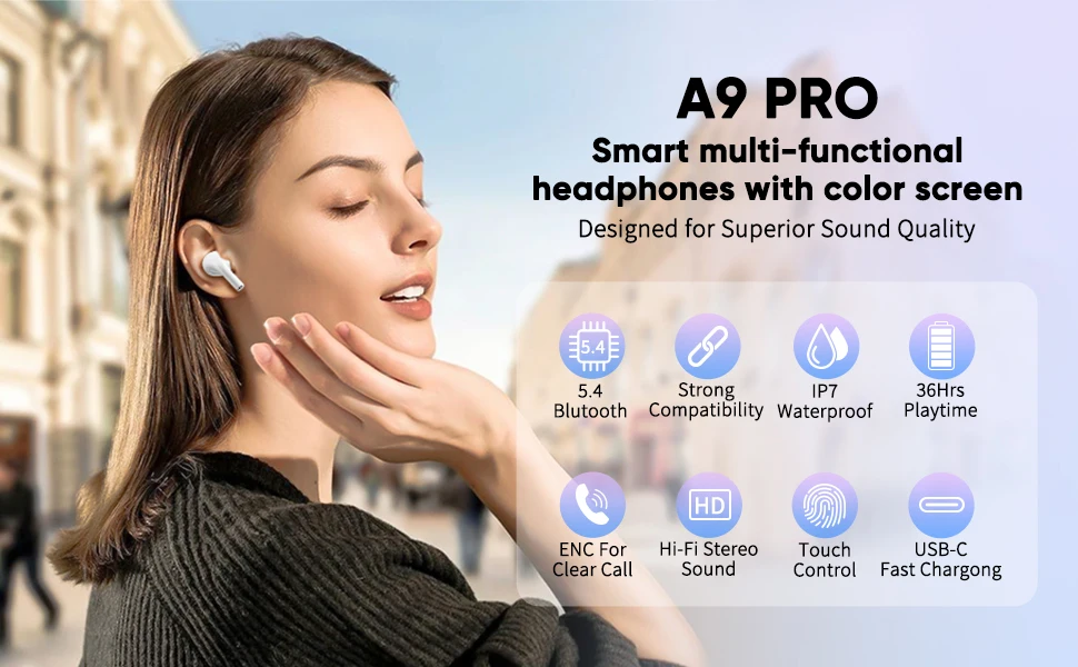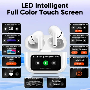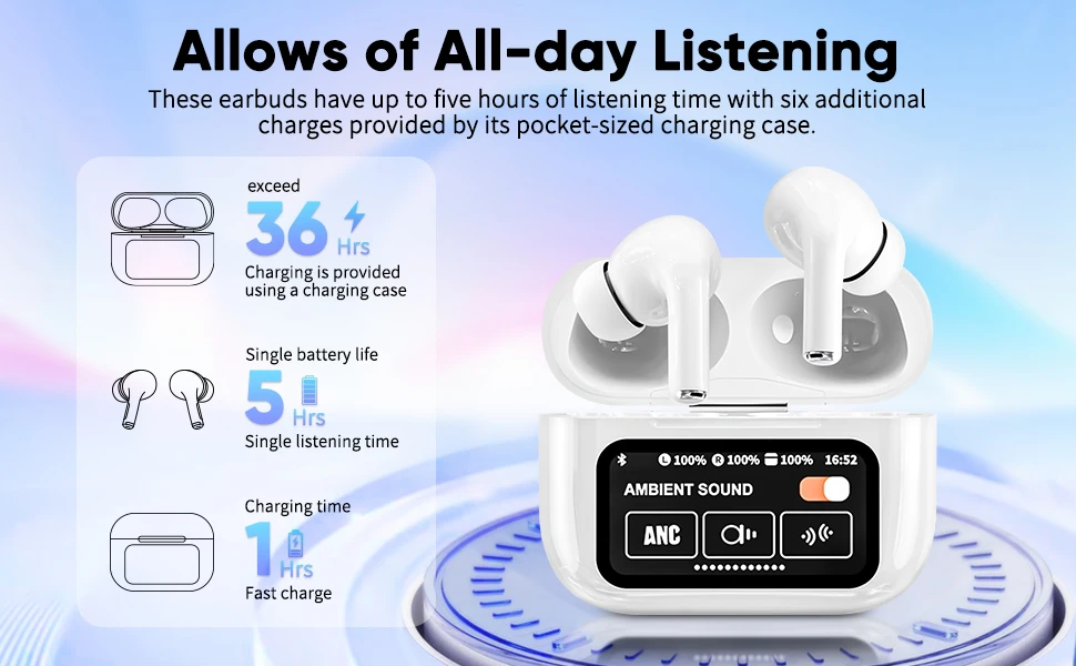 The touch-screen charging case adds futuristic convenience — check battery levels, control pairing, and enjoy quick recharging with the Type-C port. Built with active noise cancellation and soft silicone ear pads, these earphones ensure total comfort and immersive audio during calls, workouts, or travel.