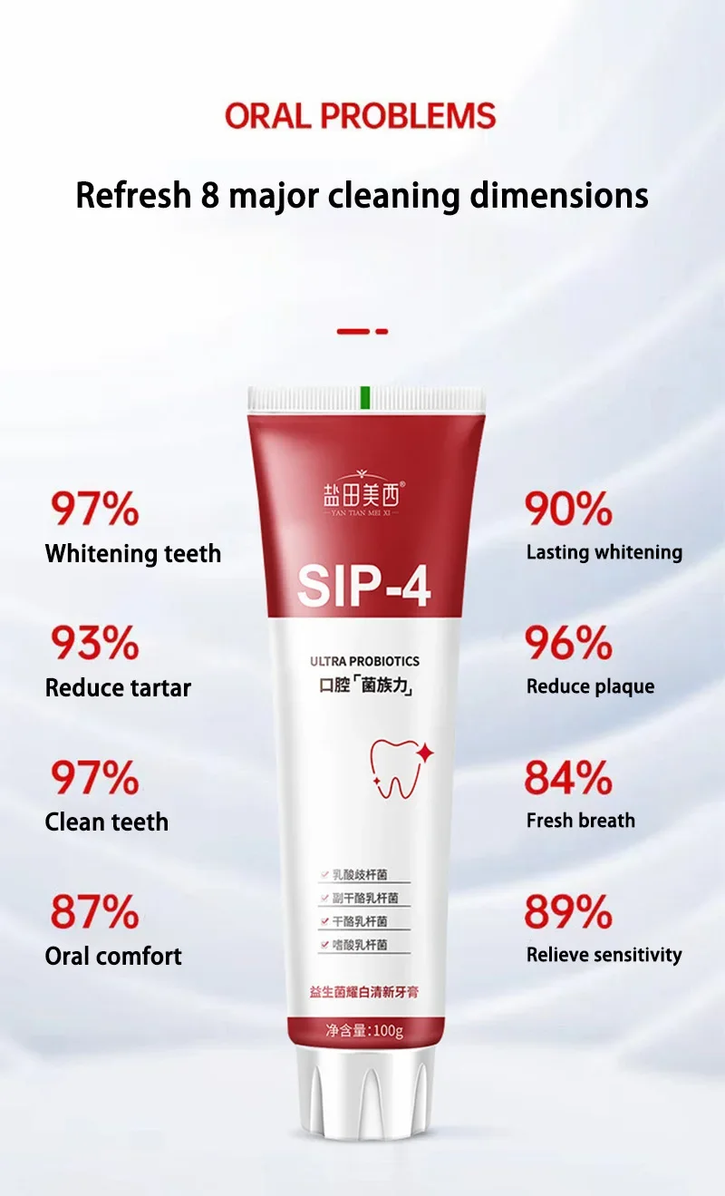 Achieve a brighter smile and healthier oral hygiene with SP-4 Probiotic Whitening Toothpaste, specially formulated to gently whiten teeth while protecting enamel. This advanced toothpaste helps remove plaque, surface stains, and buildup caused by coffee, tea, chocolate, and daily food consumption.